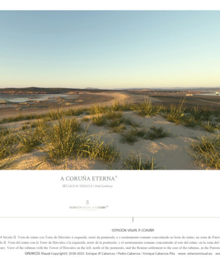 Postal A5 A Coruña Eterna, imagen virtual del istmo desde la duna de Riazor en el Siglo II