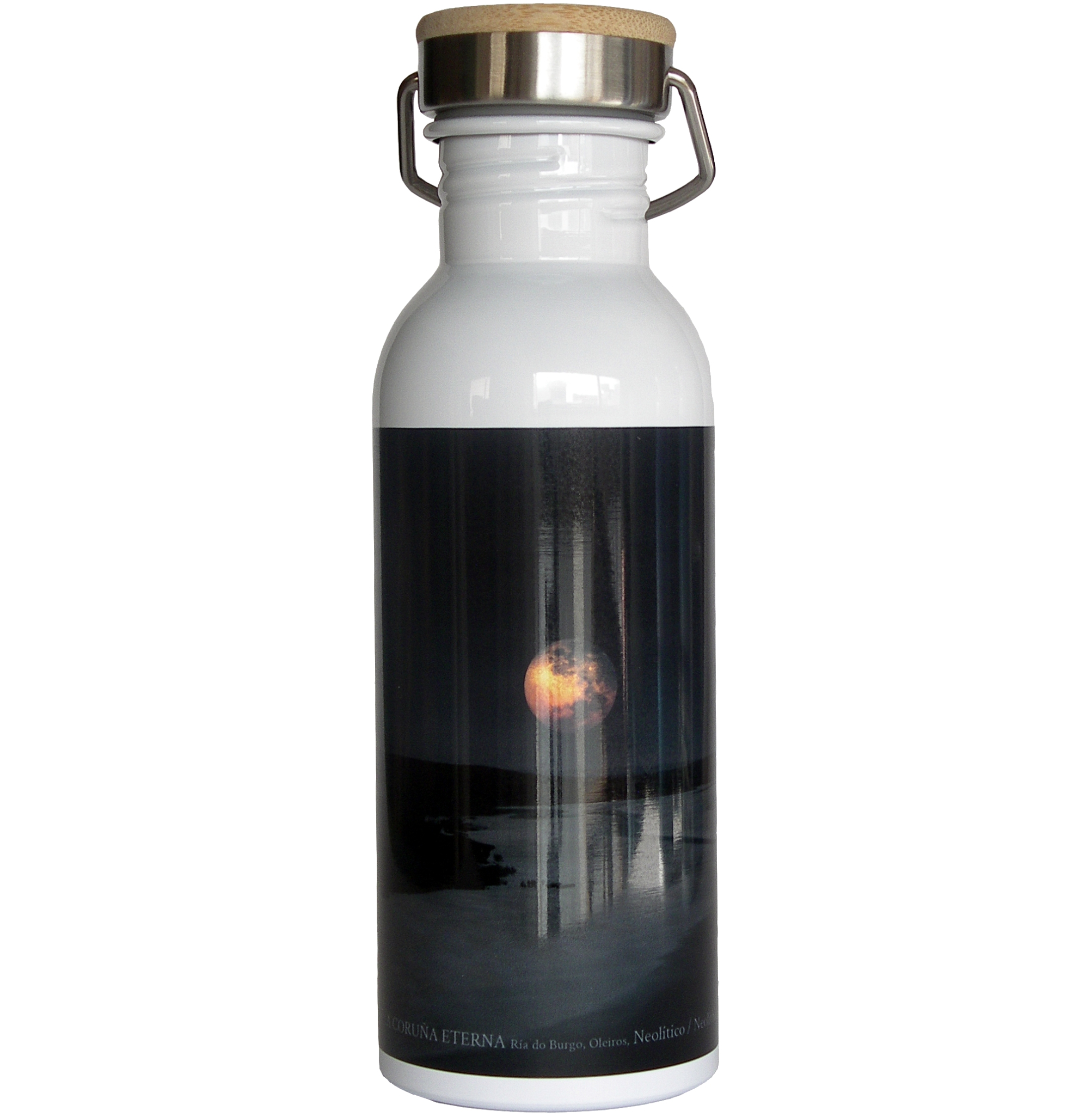 Bidón de acero inoxidable con tapa de bambú. En el Neolítico, luna roja sobre la Ría do Burgo. Grupo con canoas donde actualmente arranca el Puente del Pasaje
