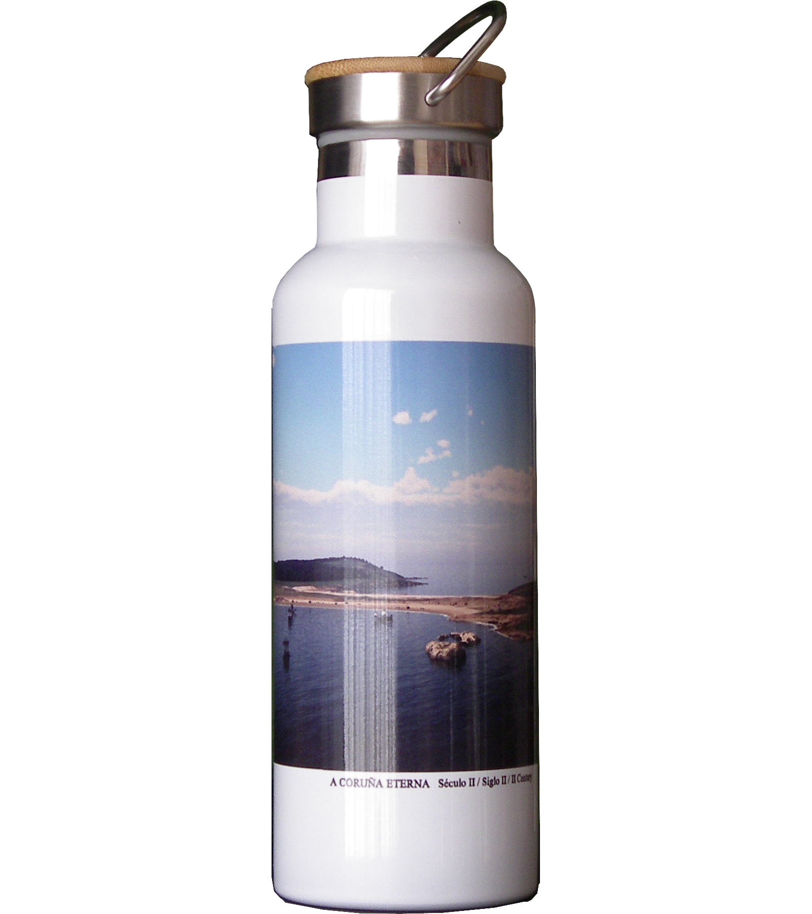 Bidón Térmico de acero inoxidable con tapa de bambú. Imagen virtual de la Bahía de A Coruña en el Siglo II
