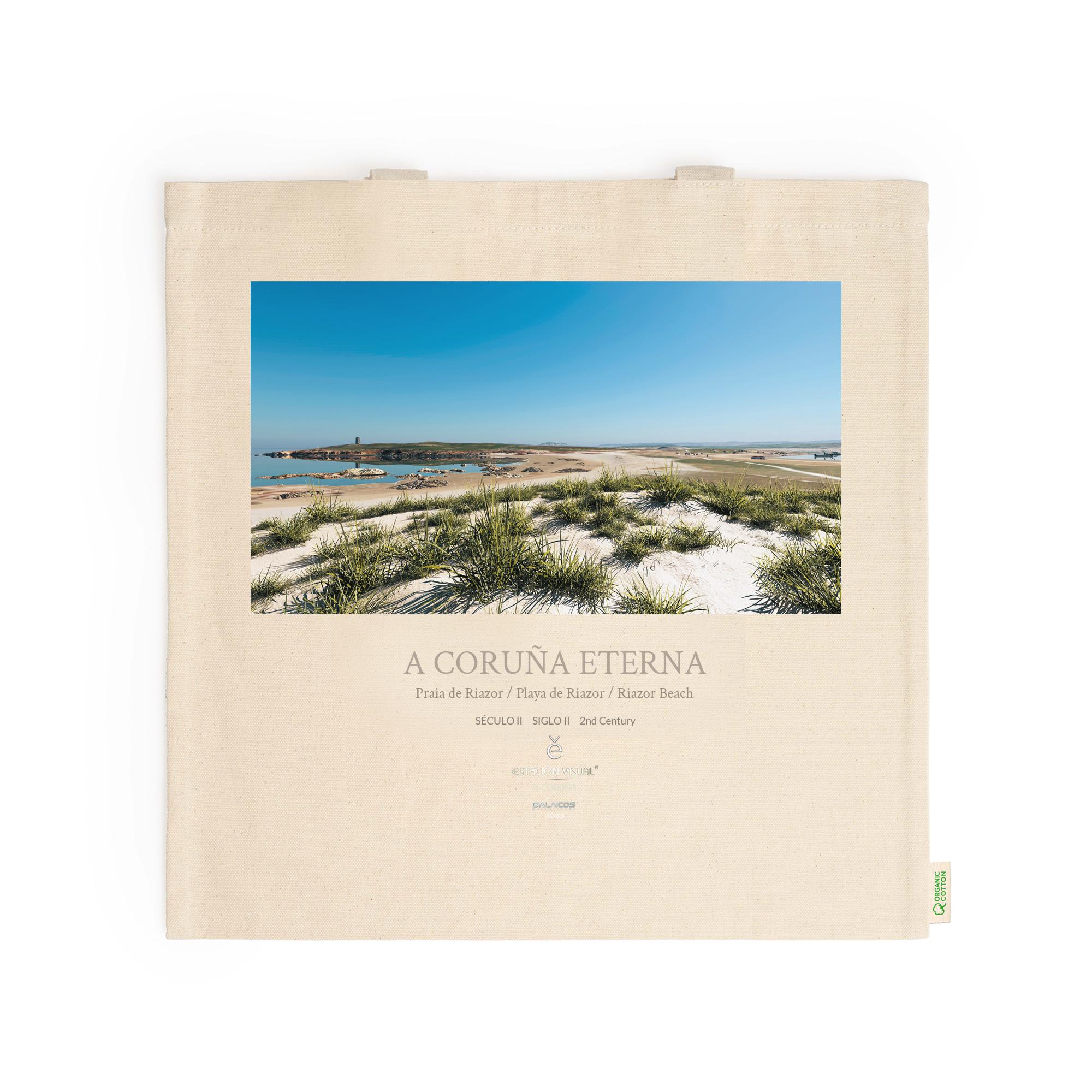 Bolsa de algodón con asas. Imagen virtual. Vista de la playa de Riazor, península y Torre de Hércules en el siglo II